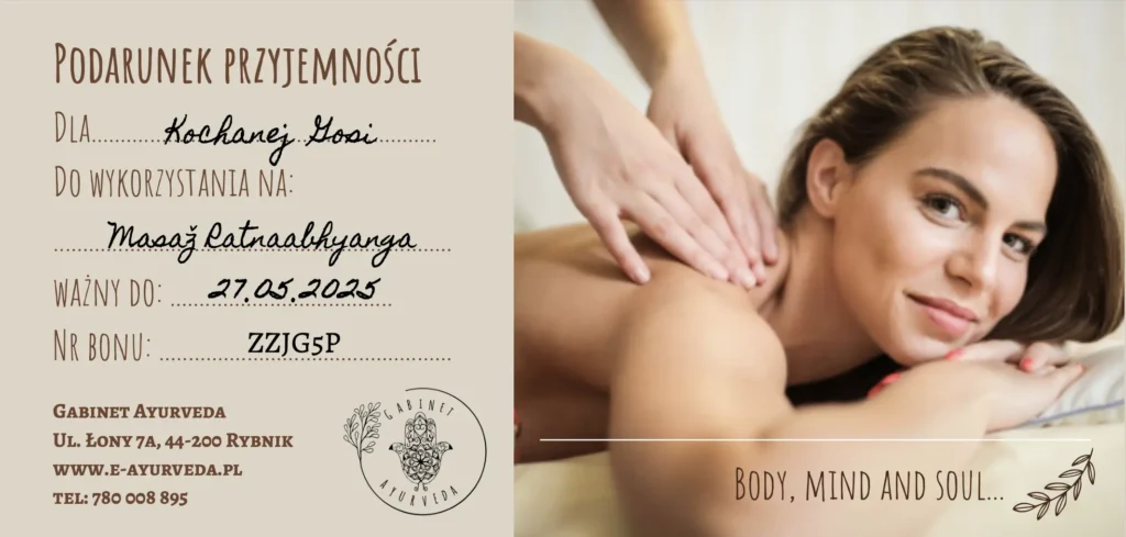 Gabinet Ayurveda Rybnik to wyjątkowe miejsce, które łączy tradycyjną ajurwedę z nowoczesnymi technikami relaksacji. Specjalizujemy się w szerokiej gamie masaży i rytuałów SPA, pomagając naszym klientom odnaleźć harmonię i odprężenie w codziennym życiu. Oferujemy profesjonalne masaże relaksacyjne, niwelujące stres i napięcie, a także masaże twarzy tj Kobido – odmładzającą technikę liftingującą. Dla Dwojga przygotowaliśmy unikalne masaże dla par, które pozwalają wspólnie cieszyć się chwilą pełną relaksu i bliskości. Nasze ekskluzywne rytuały SPA to kompleksowe ceremonie pielęgnacyjne, idealne na odprężenie i regenerację. Zapraszamy do naszego gabinetu w Rybniku, gdzie czeka na Ciebie wyjątkowa atmosfera i indywidualne podejście.